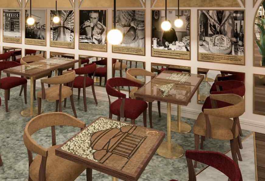 Elemento ricorrente della storica caffetteria bar Mexico è il banco coloniale, rivisitato per l’occasione, con l'avveniristico sistema azomico.